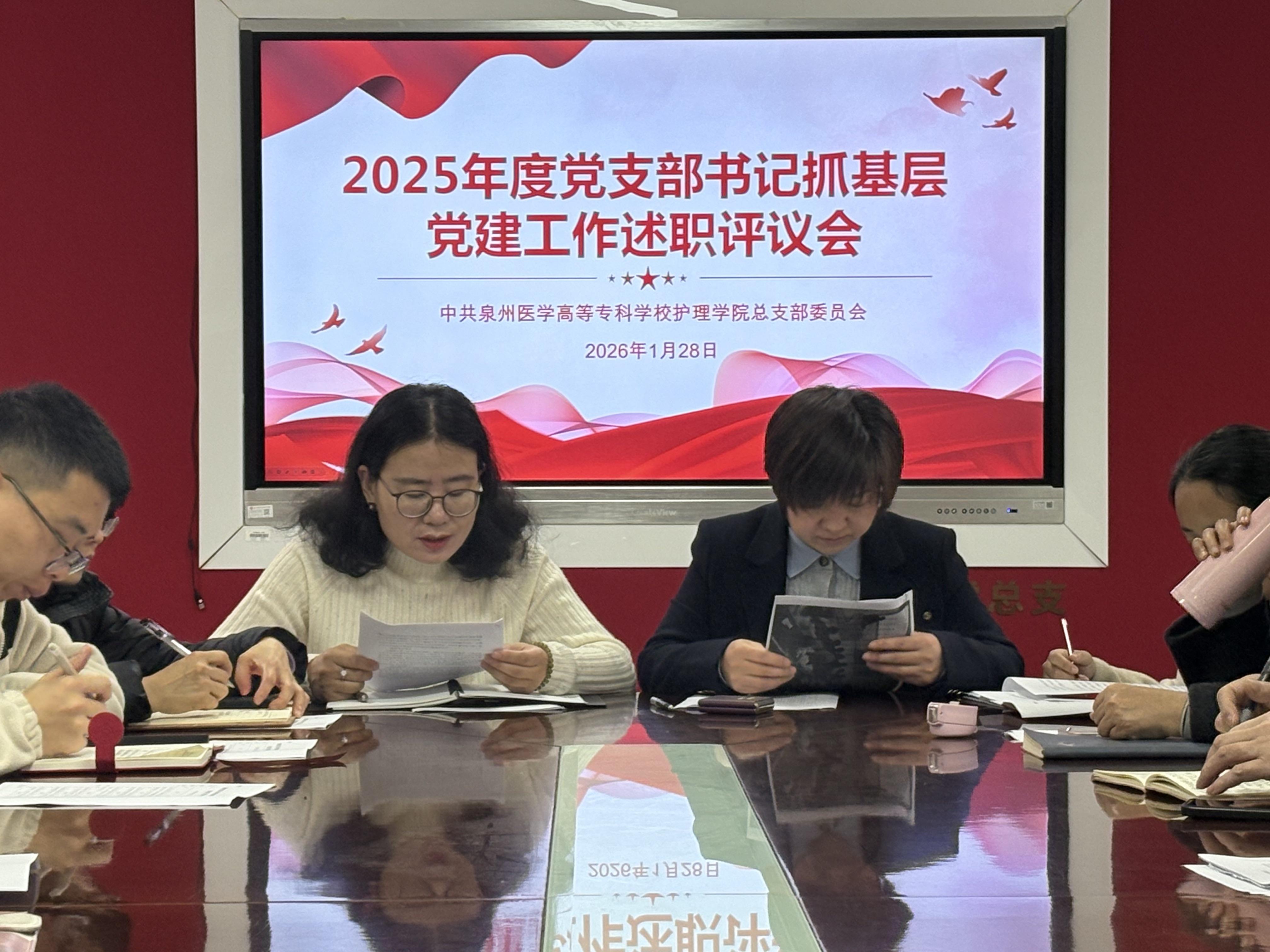 为深入学习贯彻习近平新时代中国特色社会主义思想,全面落实党的二十大和二十届历次全会精神,严格按照泉州医学高等专科学校关于开展2025年度基层党组织书记抓基层党建工作述职评议考核的工作要求,进一步压紧压实基层党建工作责任,提升基层党组织政治功能和组织功能,1月28日,护理学院召开2025年度党支部书记述职评议会。学院党总支班子成员、各党支部书记、支部委员、党员代表及非党员代表参加会议,会议由党总支书记洪迎迎主持。