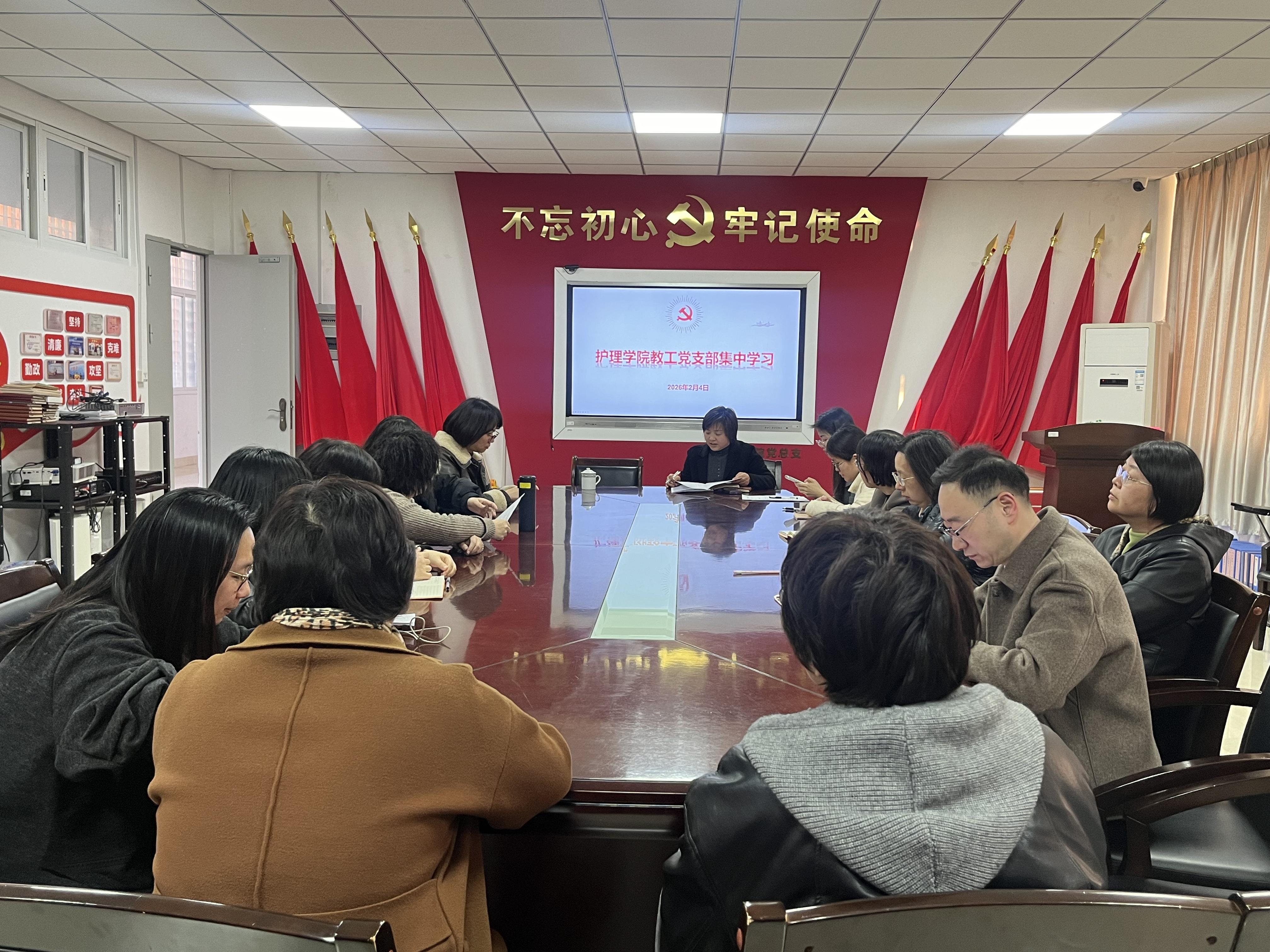 2026年2月4日,护理学院教工党支部在南附属楼308会议室组织召开集中学习会议,会议由支部书记龚国梅主持。本次学习会旨在深入学习贯彻习近平总书记系列重要讲话精神及上级重要会议精神,进一步统一思想、凝聚共识,推动学院党建工作与教育教学工作深度融合。