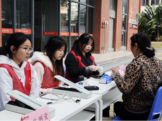 3月7日上午,校园专场活动在洛江校区一站式学生社区服务中心暖心开展。活动现场,学生志愿者免费提供血糖、血压检测服务,倡导医学生关注自身健康,科学自护;有的学生组成健康宣传小队,结合当代人爱喝奶茶的普遍习惯,向过往的学生宣传倡导 “懂糖控糖、健康饮食”的生活方式,提醒同学们理性对待高糖饮品,在享受美食的同时守护身体健康。