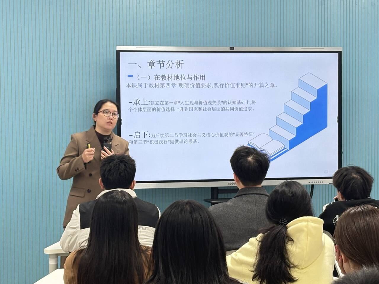 备课会上,林婷婷和郭彩汾两位教师分别围绕《习近平新时代中国特色社会主义思想概论》和《思想道德与法治》进行说课展示。林婷婷聚焦课程体系与理论联系实际的原则,强调用鲜活案例讲清理论,推动党的创新理论入脑入心。郭彩汾则立足高职学生特点,从课程定位、教学设计等方面阐述如何以文化人,将社会主义核心价值观融入教学。