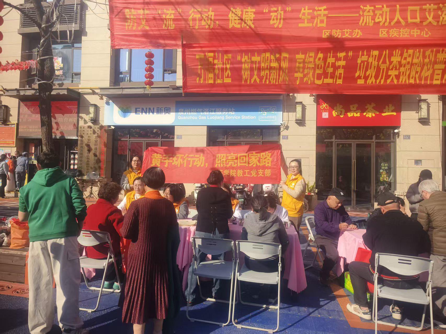 为深入学习贯彻习近平新时代中国特色社会主义思想,推动党建与志愿服务深度融合,积极响应“黄手环行动”公益号召,切实守护社区高龄老人出行安全,3月11日下午,泉州医学高等专科学校药学院教工党支部走进万福社区,开展“黄手环行动,照亮回家路”主题党日活动,免费为社区高龄老人办理黄手环、提供相关咨询服务,用暖心举措为高龄老人筑起安全防护网,以实际行动传递党的关怀与温暖。