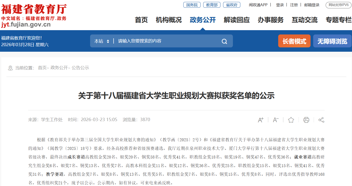 近日,由福建省教育厅主办的第十八届福建省大学生职业规划大赛拟获奖名单正式公示。我院23级药品经营与管理专业潘静怡同学荣获第十八届福建省大学生职业规划大赛就业赛道(职教组)优秀奖。