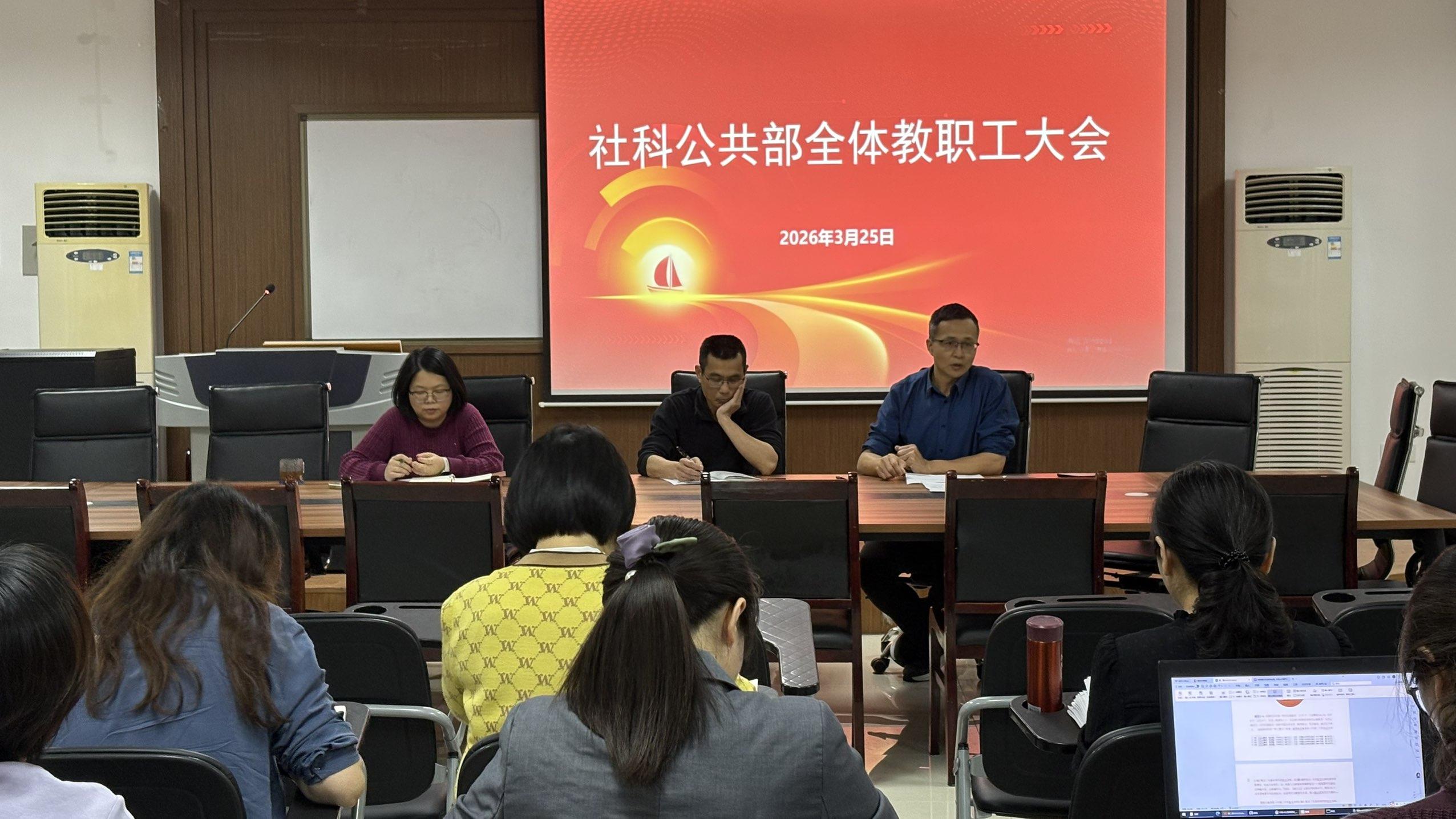 3月25日下午,社科公共部在信息楼7楼大会议室召开2025-2026学年下学期全体教职工会议。张勇主任主持会议,社科继教党总支书记曾树东、社科公共部副主任张敏出席会议,部门全体教职工参加会议。
