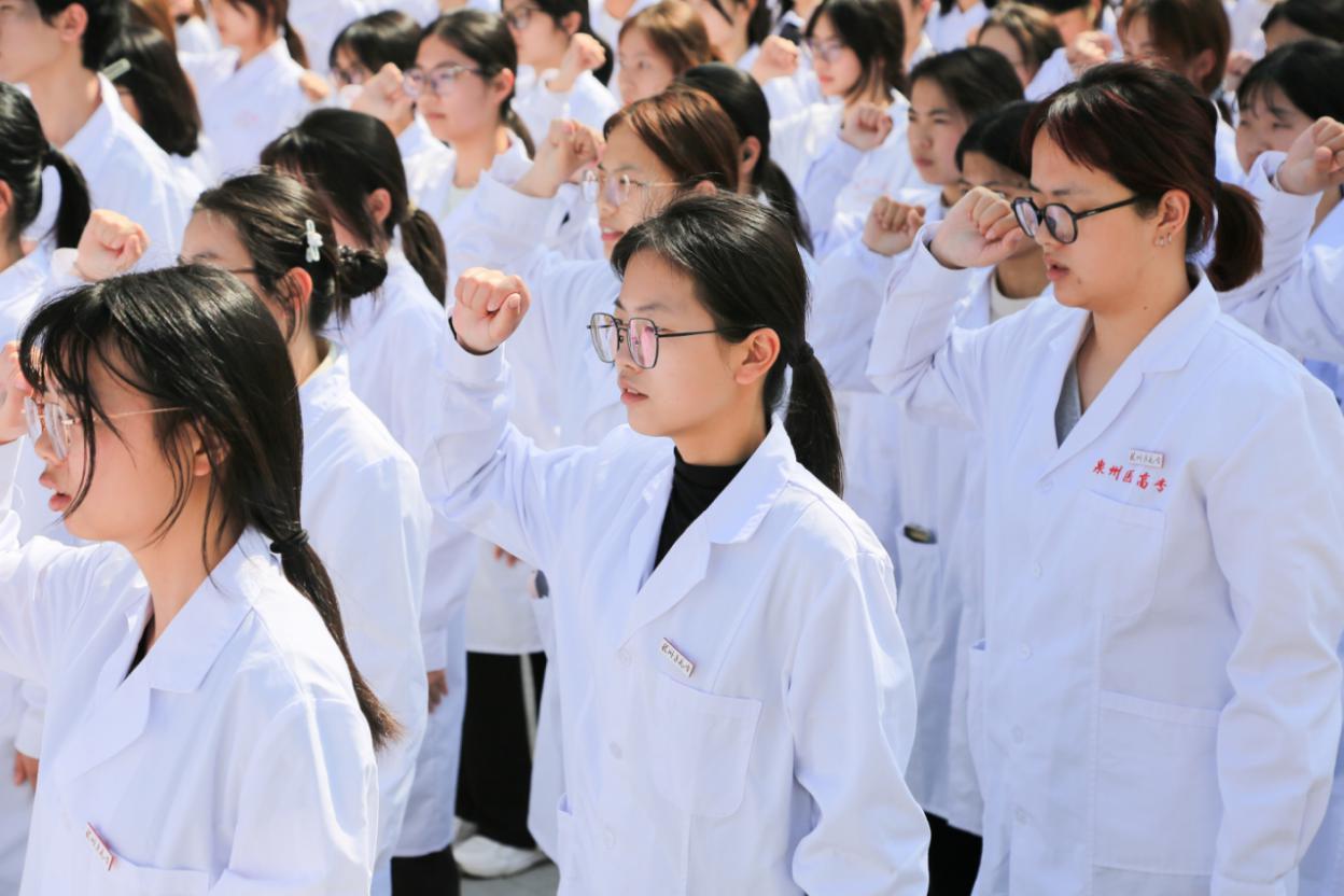 “我宣誓:永怀敬畏,感恩生命之馈赠;精研医术,恪守仁心之誓言……”在领誓人许相洋老师的带领下,现场全体医学生举起右手,庄严宣誓。铿锵有力的誓言在校园内回荡,表达了他们立志献身医学、守护生命的坚定信念。